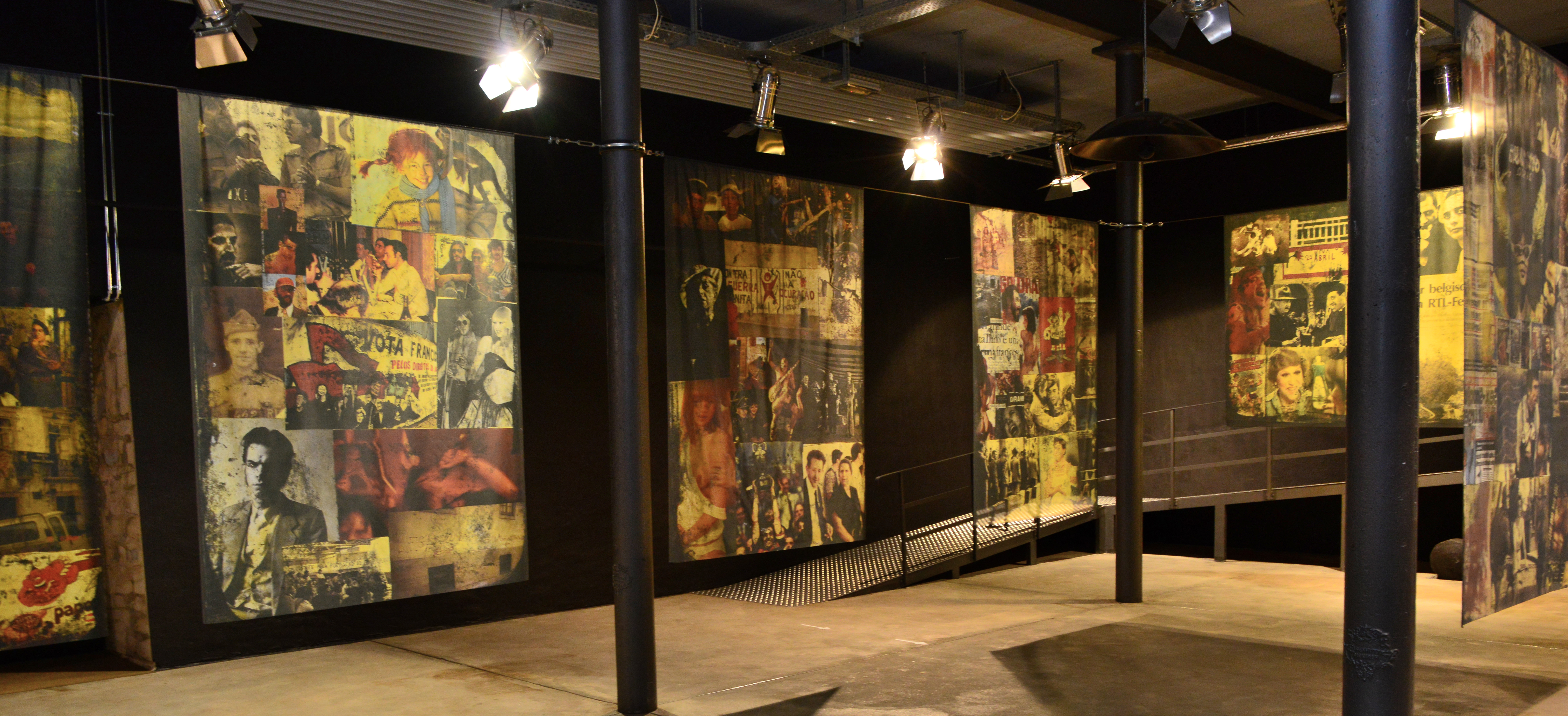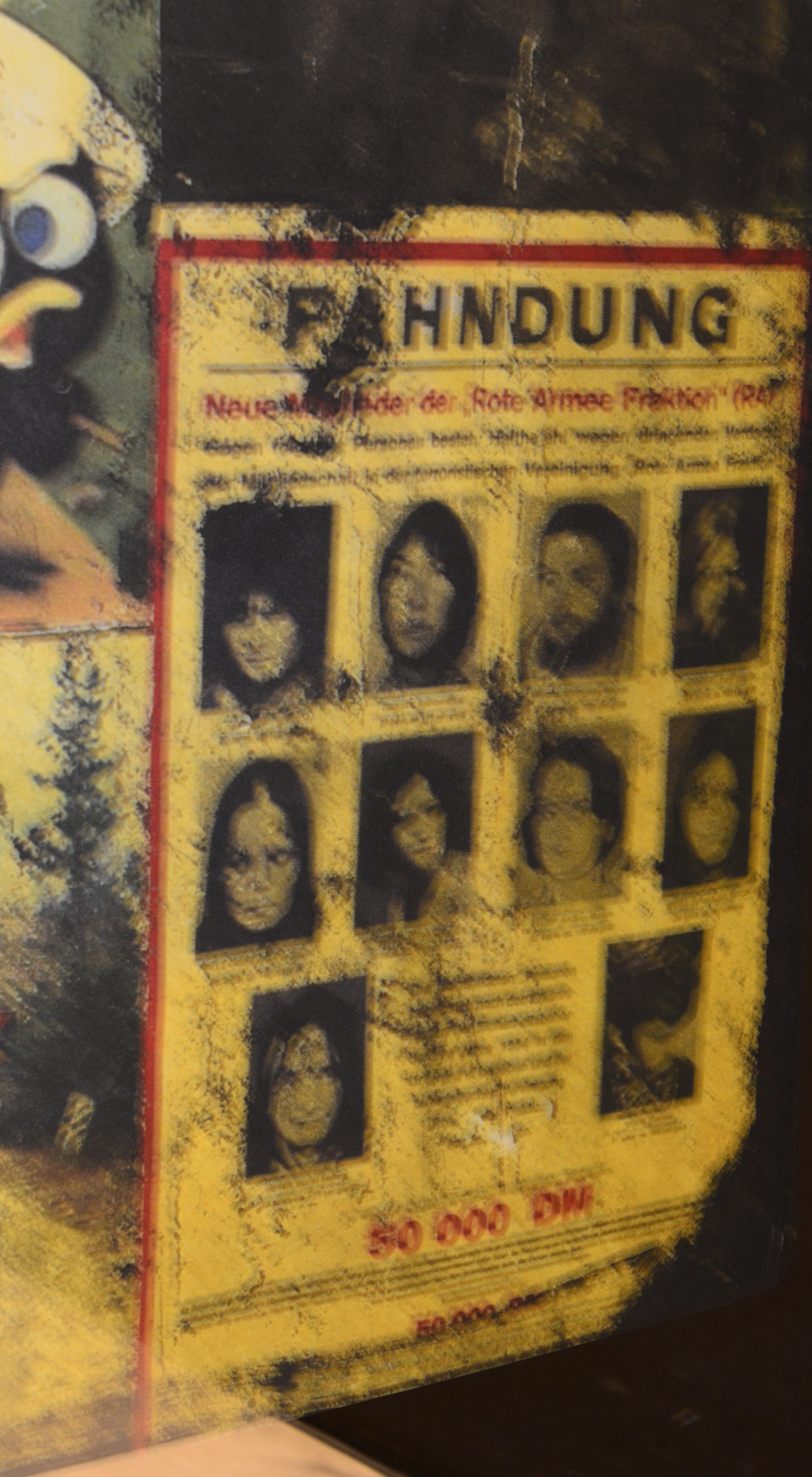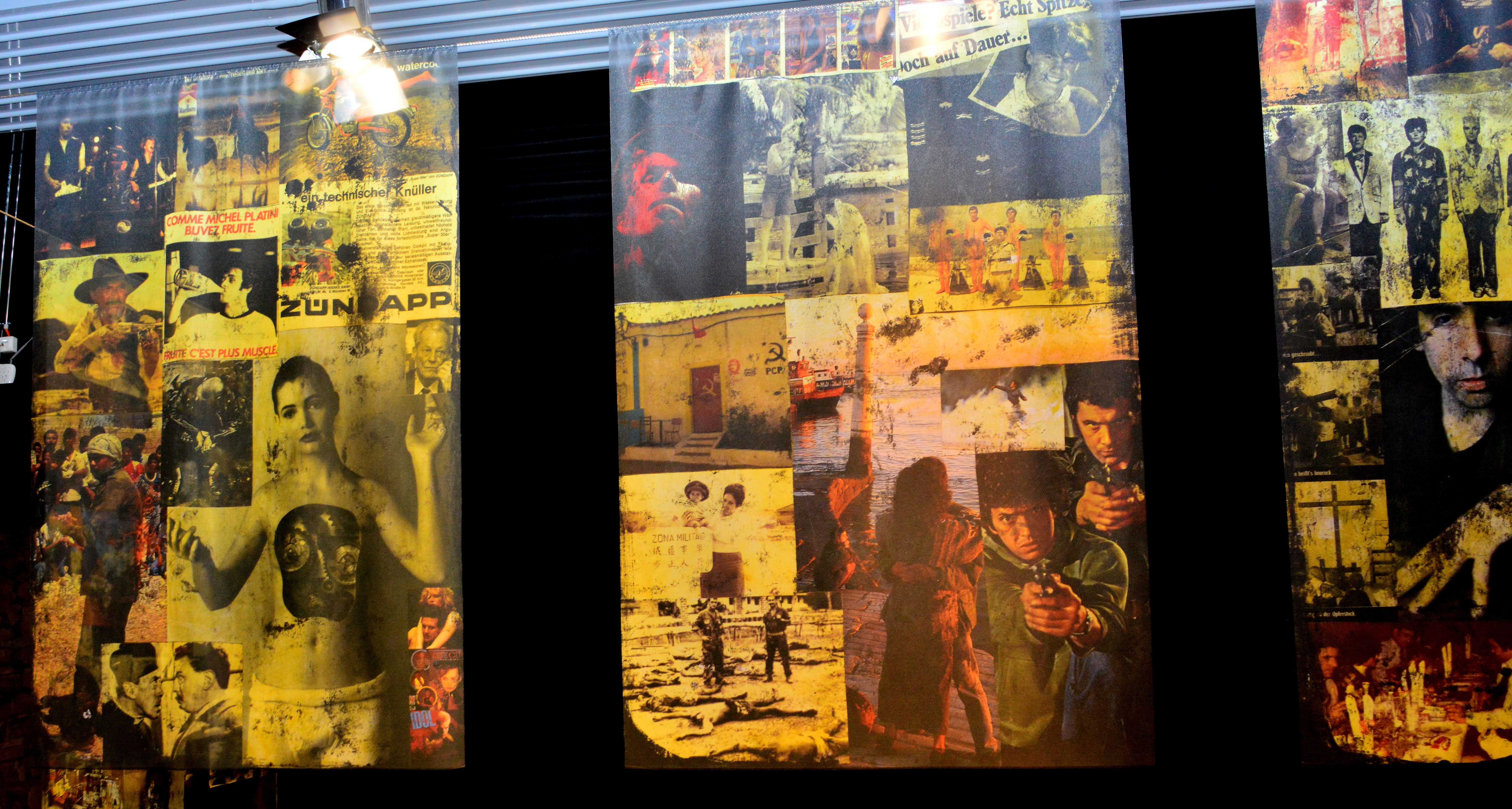 These easily moveable sheets hanging like the washing on the line, illuminated from behind, are densely printed in form of a collage, consisting of images taken from comics, newspapers, magazines, record sleeves, a private photo album etc. all of it dating from that period. These images are showing everyday life: Snapshots from the worlds of music and cinema,news reporting and sports, advertising and politics. They are not iconic images and definitely not conveying participation in a victory parade (Walter Benjamin). Despite occasionally including photos and graffiti from the time of the