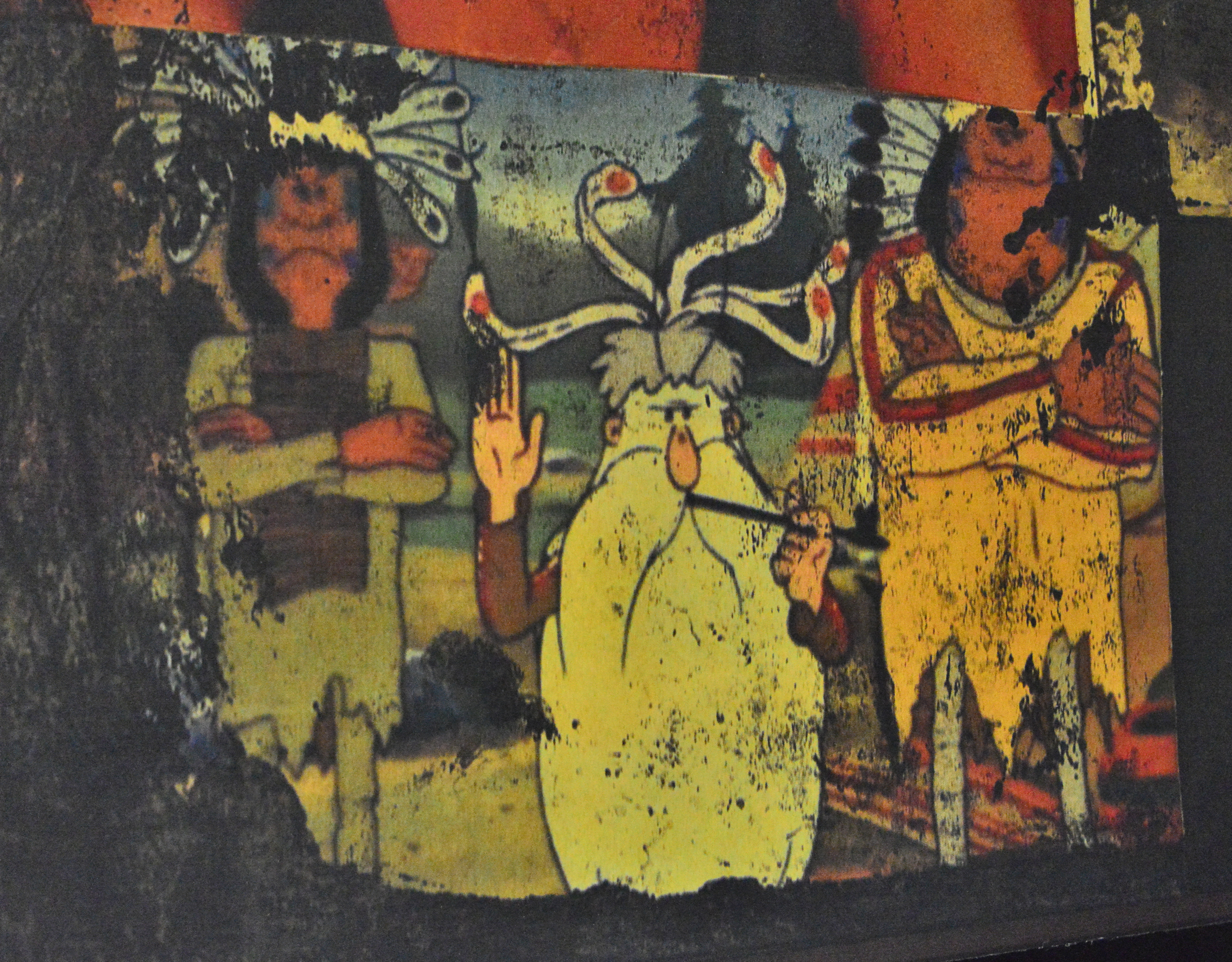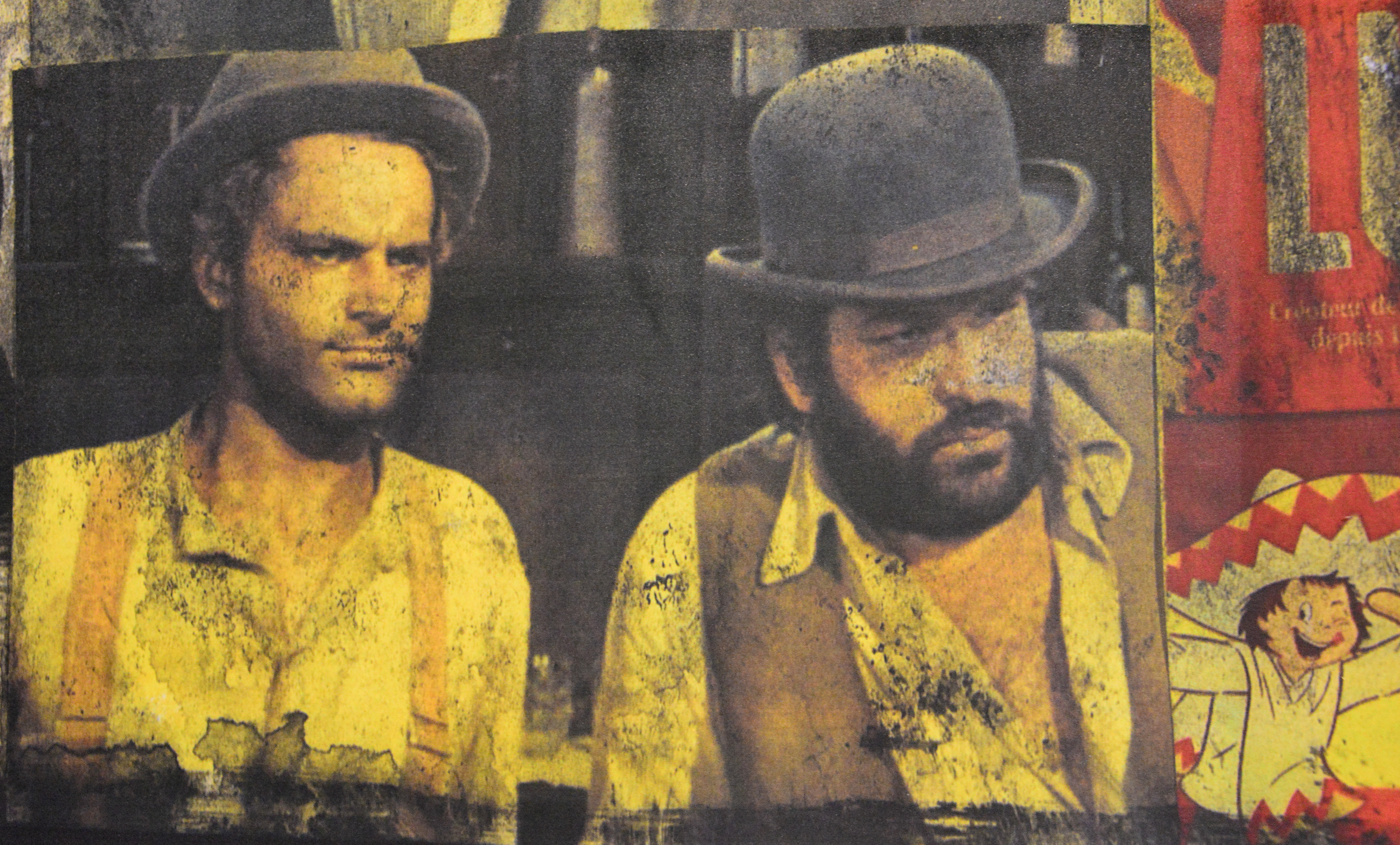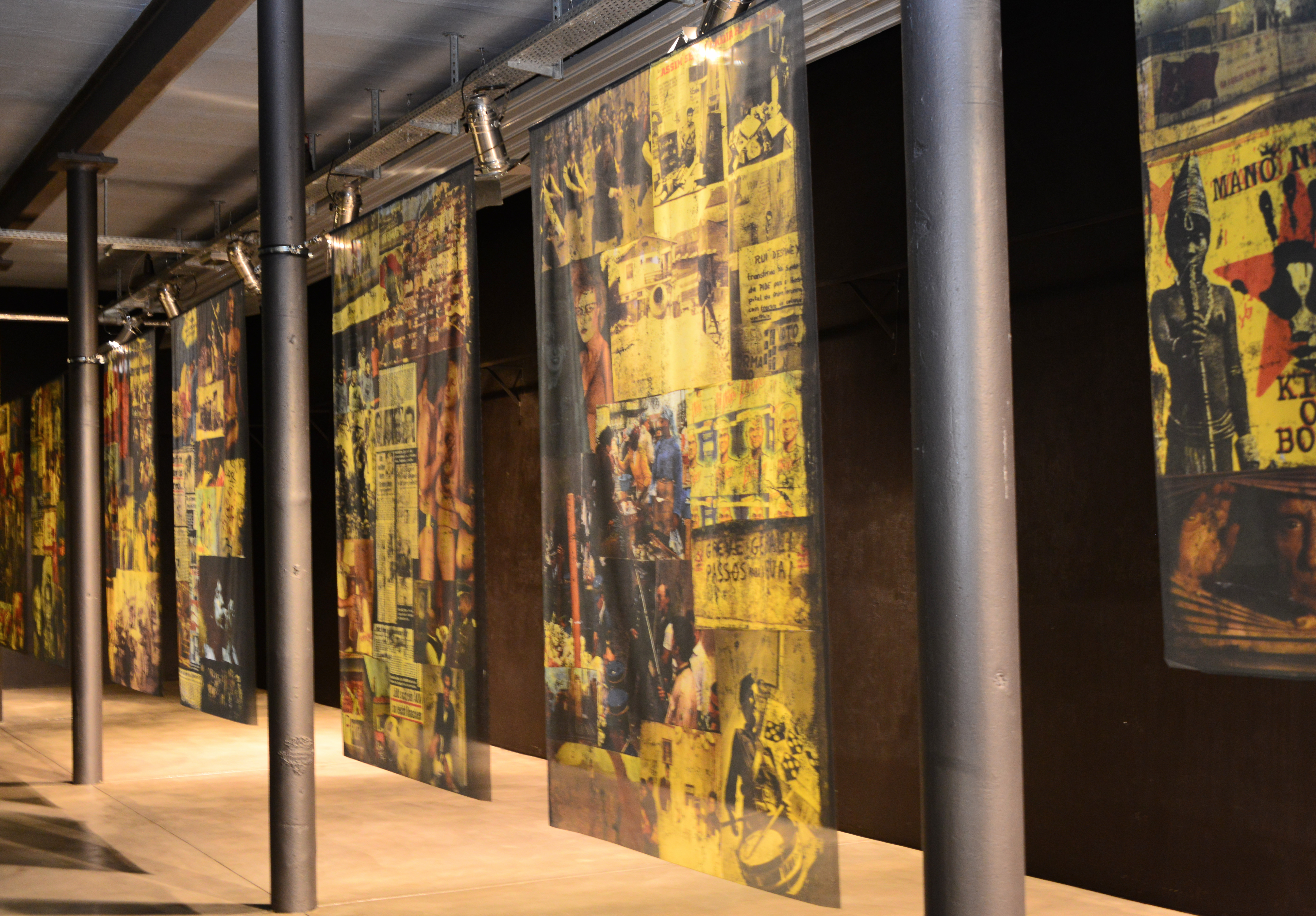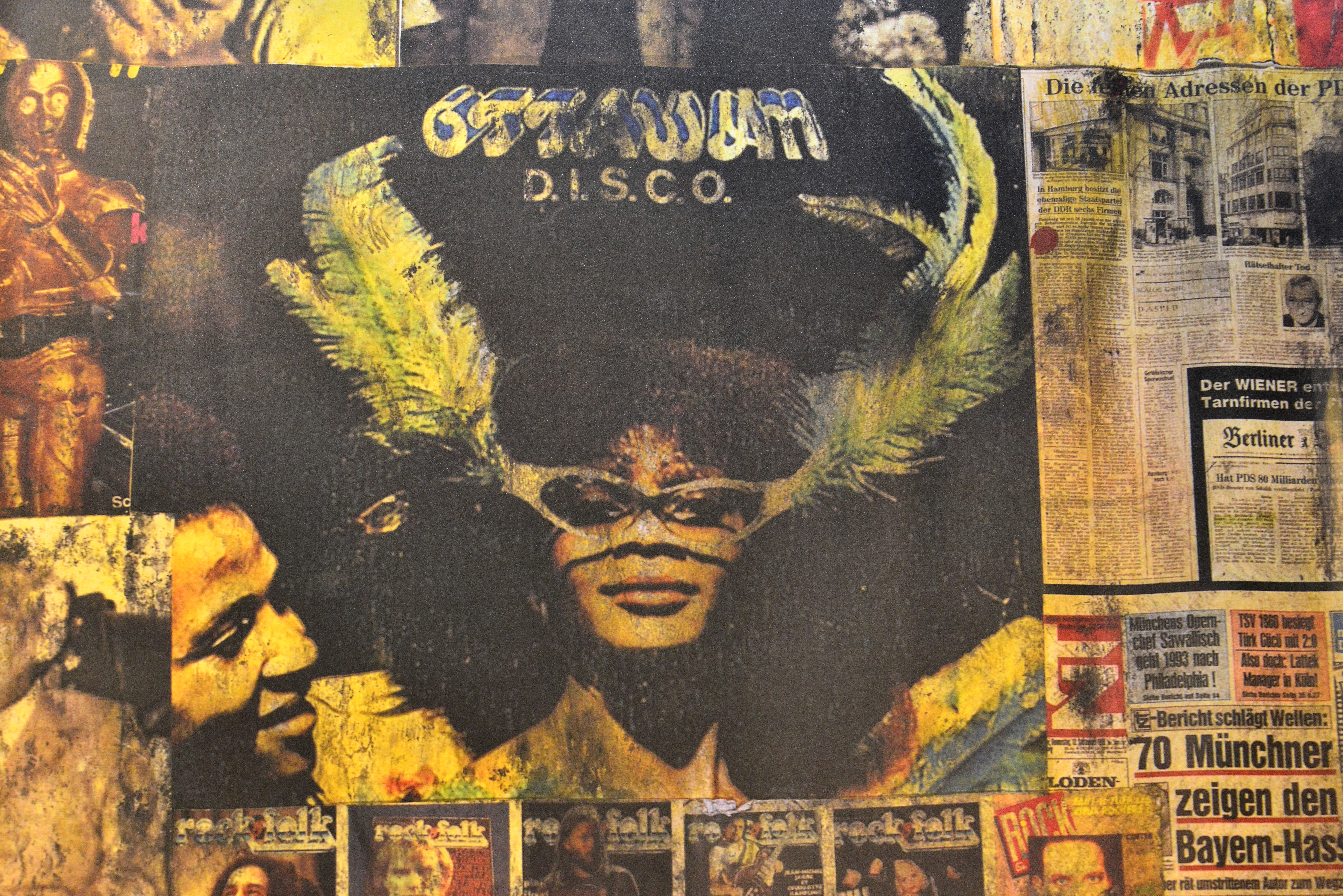 These easily moveable sheets hanging like the washing on the line, illuminated from behind, are densely printed in form of a collage, consisting of images taken from comics, newspapers, magazines, record sleeves, a private photo album etc. all of it dating from that period. These images are showing everyday life: Snapshots from the worlds of music and cinema,news reporting and sports, advertising and politics. They are not iconic images and definitely not conveying participation in a victory parade (Walter Benjamin). Despite occasionally including photos and graffiti from the time of the